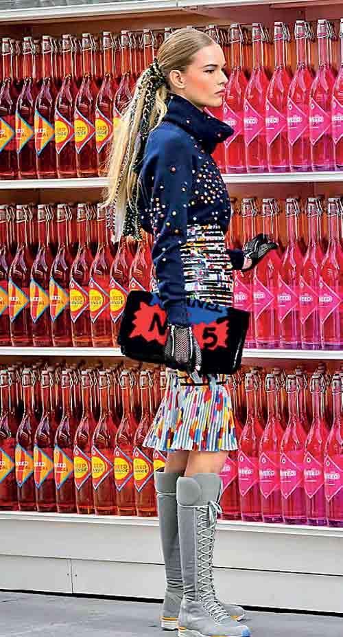 Couture in a supermarket. Not a metaphor, an actual supermarket with actual aisles, actual shelves stacked with Chanel-branded pasta, tea, and hand soap alongside models casually grabbing ham stamped with the iconic CC logo. At the Autumn 2014 show, models navigated the aisles, pushed customised carts and maybe even snagged a can of beans on the way, blending luxury with everyday grocery runs.