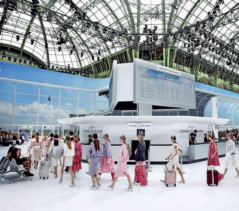 Airports, too, get the Chanel treatment. For Spring 2016, the runway becomes a full terminal and specifically Terminal 2C. Check-in desks, luggage belts, departure and arrival boards, and even boarding passes that read “Chanel Airlines”. Models strut past counters, carry-ons in hand, pretending to check in while rocking tweed skirts worth more than most of our monthly rent - meanwhile, the rest of us are basically in pyjamas by comparison.