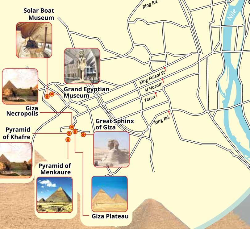 Modern visitors can explore the site easily from Cairo, just 20 kilometers away. Approaching the plateau, you see the pyramids rise from the haze immense, silent, almost surreal. Guided tours lead inside the Great Pyramid, through chambers where the air feels ancient, and to panoramic viewpoints where all three pyramids and the Sphinx align against the desert sky. Nearby, the Solar Boat Museum houses the restored wooden vessel buried beside Khufu’s pyramid intended to carry the pharaoh across the heavens. The Giza plateau also now includes a visitor center and the upcoming Grand Egyptian Museum, which will showcase treasures never before displayed to the world.