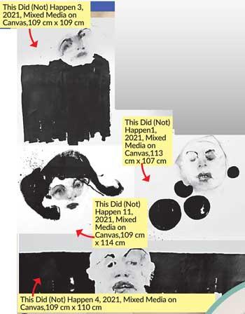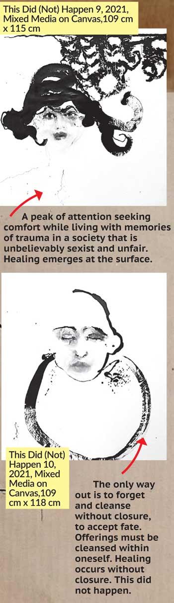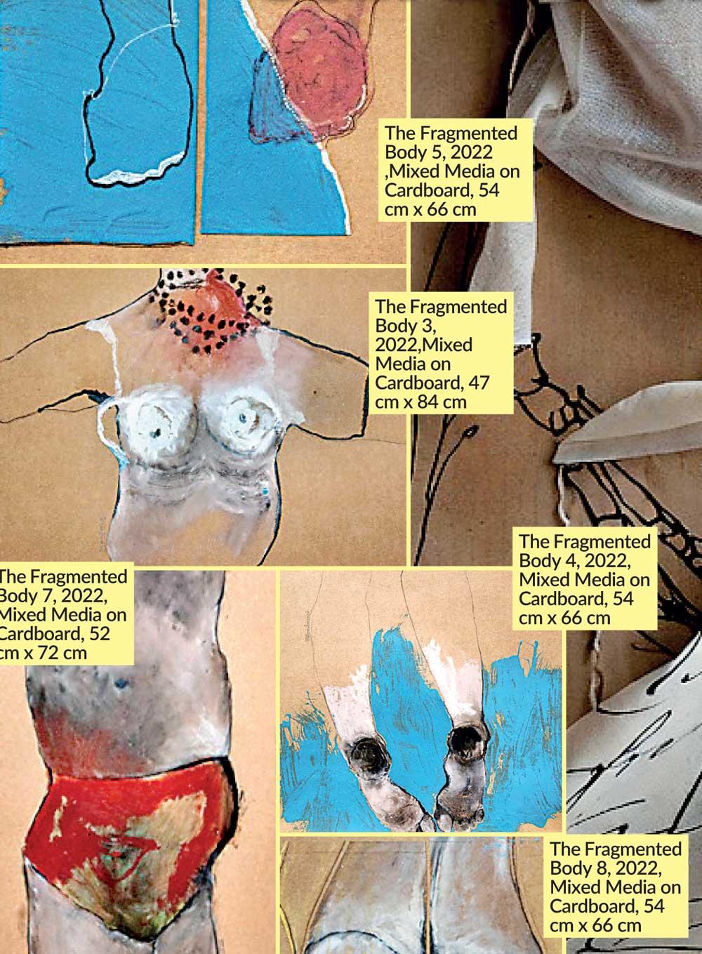 The body is an inner topography. It gives us a panoramic view of our past. The Fragmented Body is a series on brown cardboard sheets showing disembodied segments of male and female bodies. The arms, legs, and torsos carry a darker story of violence, hurt, and mutilation.