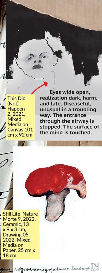 First, all the sensations I felt when meeting the many Sri Lankans around a drawing table expressing themselves. They remained silent, but I could feel the many layers of pain and sadness; untold, unspoken. While working on this exhibition Still Life – Nature Morte, I processed these drapes, inviting the viewer to be The Other and to speak about their own invisible wounds and hidden traumas.