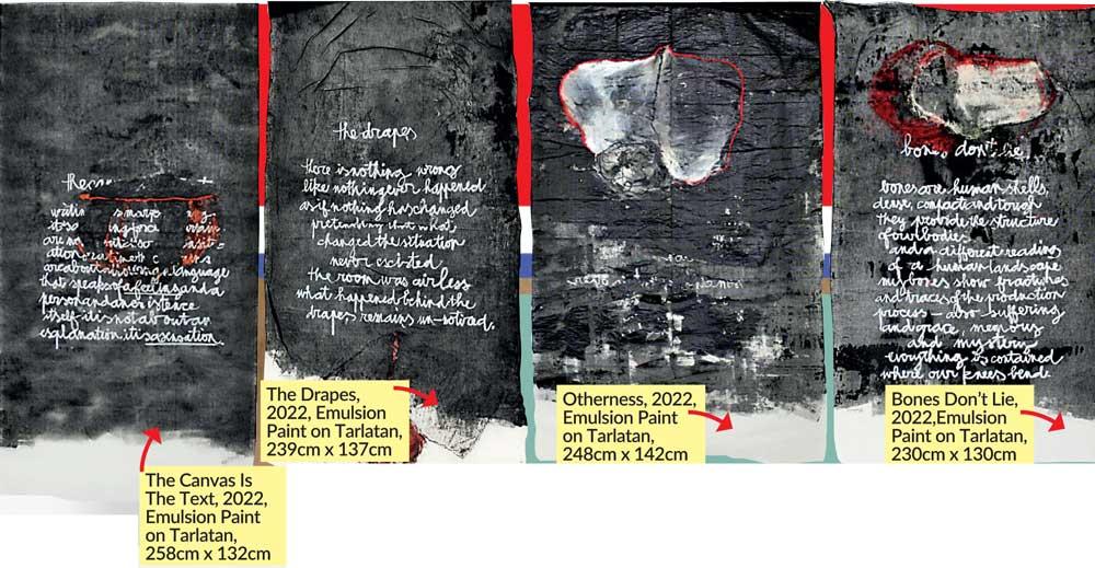 Bones Don’t Lie, 2022, Emulsion Paint on Tarlatan, 230cm x 130cm Bones Don’t Lie is an extremely powerful drape, the final answer. It carries you to the utter depths of the earth and stays with you. It reminds us that humans are complex and complicated. The work evokes sensation. The curtains carry lines of text inviting viewers into another place, their inner place. This connection creates bridges between worlds. At the end of the day, we are all alike.