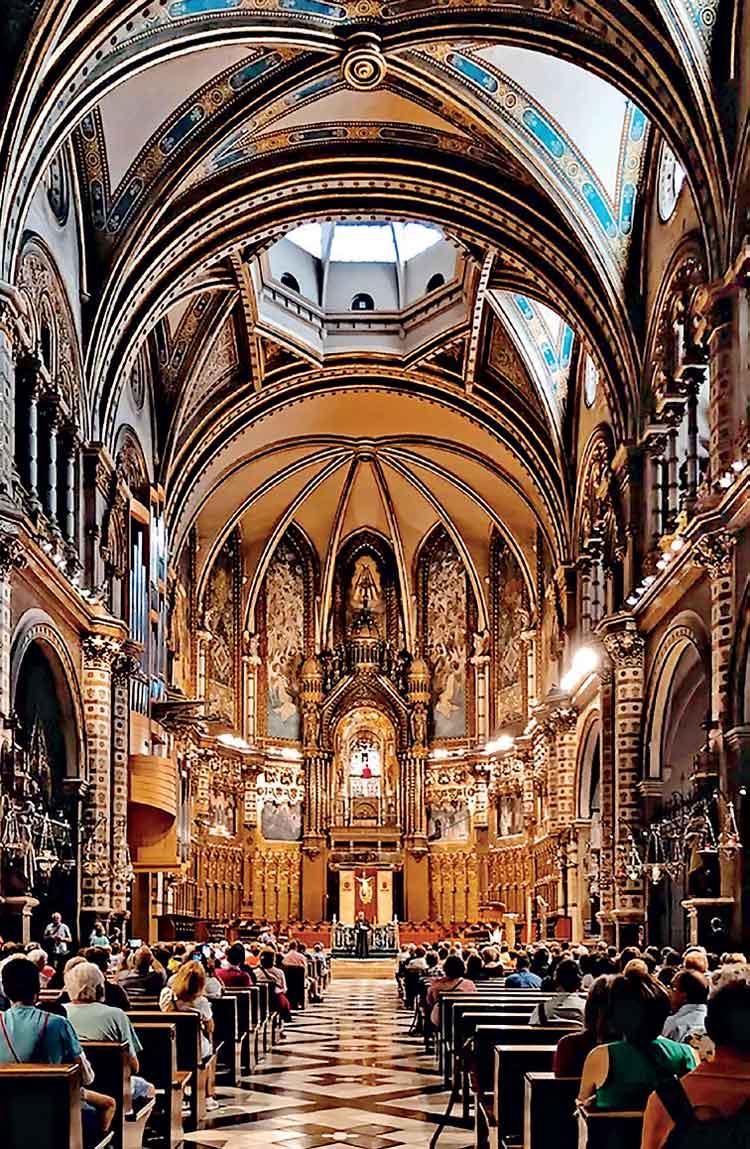 At the heart of Montserrat stands the basilica, a space of quiet reverence filled with candlelight, incense, and hushed voices. Entering the basilica felt like stepping into a different rhythm of time. The world outside faded. The air was heavy with stillness. The focal point of the basilica is the image of the Virgin of Montserrat, affectionately known as La Moreneta, the Black Madonna. This small statue is one of the most revered religious images in Spain and the patron saint of Catalonia. Carved in the Romanesque style in the twelfth century, the Virgin sits enthroned with the Christ Child on her lap. The figures are formal and symmetrical, radiating quiet authority. The Virgin holds a sphere in her hand, symbolising the universe and spiritual sovereignty, while the child raises his hand in blessing.